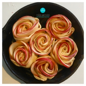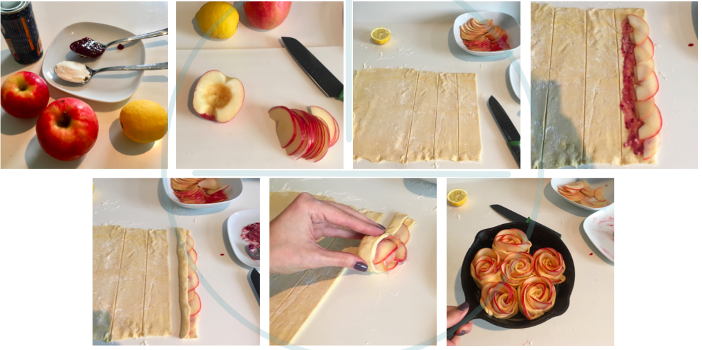 - Απλώνουμε λίγο μίγμα μαρμελάδας στην πρώτη λωρίδα και τοποθετούμε σε μία σειρά τις φέτες μήλου (διαλέγουμε τα πιο κόκκινα)..